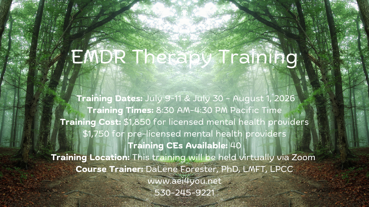 Space is limited to 20 registrants. Registrants cancelling after a registration has been processed will receive a tuition refund less a $175.00 administrative fee and will be responsible for all credit card processing fees charged by the banks involved. No refund for cancellations less than 72 hours in advance. A $25.00 service charge applies to each returned check. All in-person trainings by DaLene Forester, PhD, LMFT, LPCC, are held in facilities in accordance with the Americans with Disabilities Act. If special accommodations are required, please notify DaLene Forester, PhD, LMFT, LPCC, immediately upon registration and at least 2 weeks prior to the training date.
