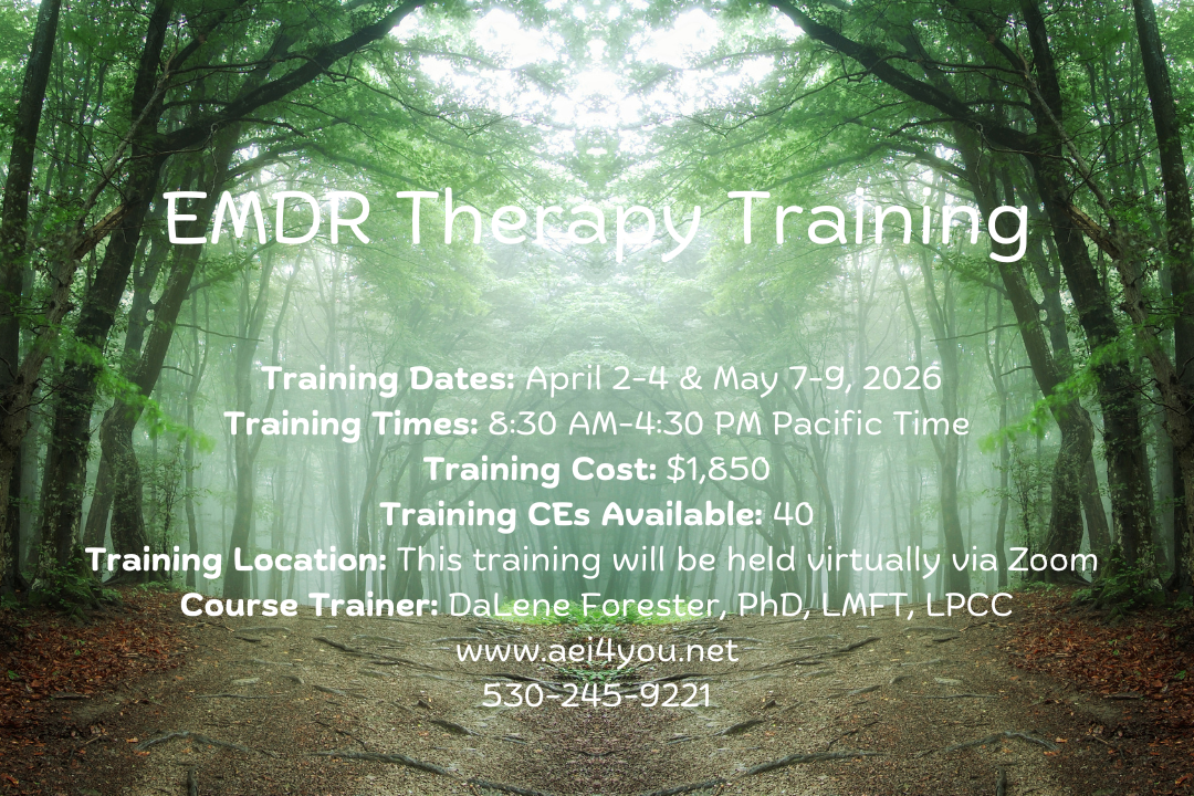 All AEI Trainings and Trainings by DaLene Forester, PhD, are approved for NBCC Continuing Professional Development and Education Credits. Advanced Education Institute (AEI) and DaLene Forester, PhD, have been approved by NBCC as an Approved Continuing Education Provider, ACEP No. 6657. Programs that do not qualify for NBCC credit are clearly identified. AEI is solely responsible for all aspects of the programs.